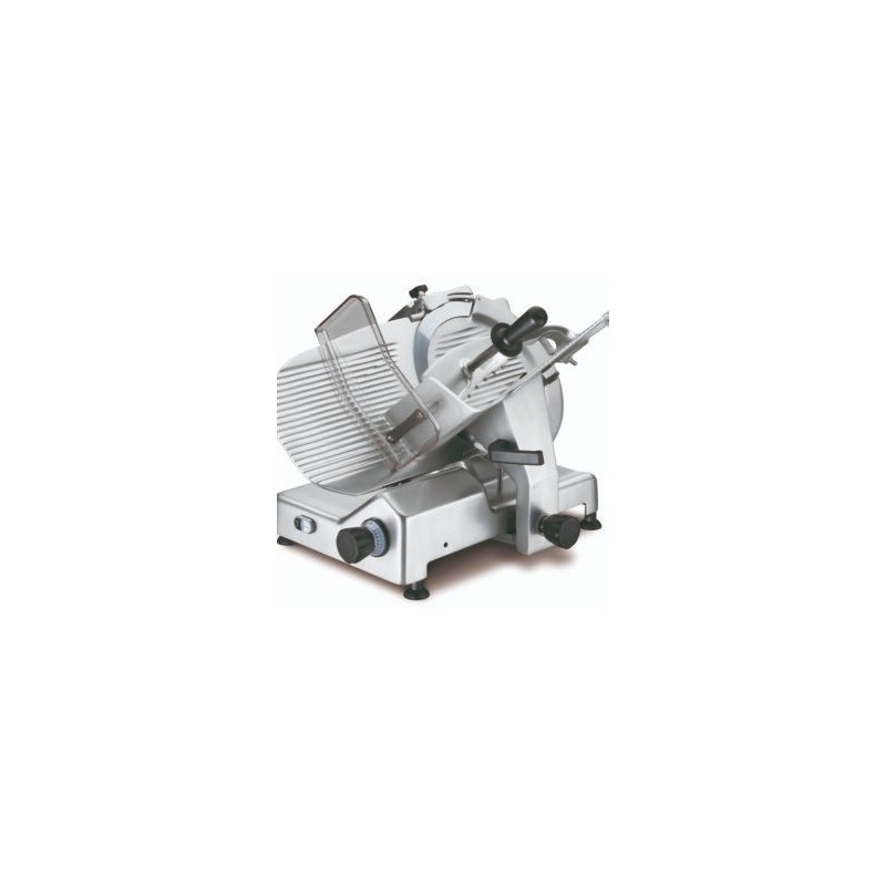Cortadora de cuchilla 350 de engranajes adecuada para el corte de embutidos y quesos, es muy es compacta diseñada para charcuterías, restaurantes y supermercados con producciones altas y uso continuo.