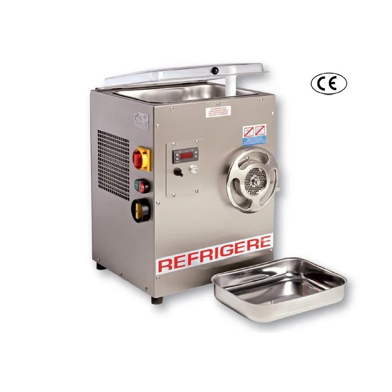 Picadora refrigerada Boca: 22. Cuerpo: acero inoxidable. Grupo picador: acero inoxidable. Cuchilla: autoafilante. Interruptor: invertidor de marcha. Potencia 1,5 HP. Grupo refrigerador hermético ventilado. Motor monofásico/trifásico Peso: 58 kg. Producción: 200 kg/h.